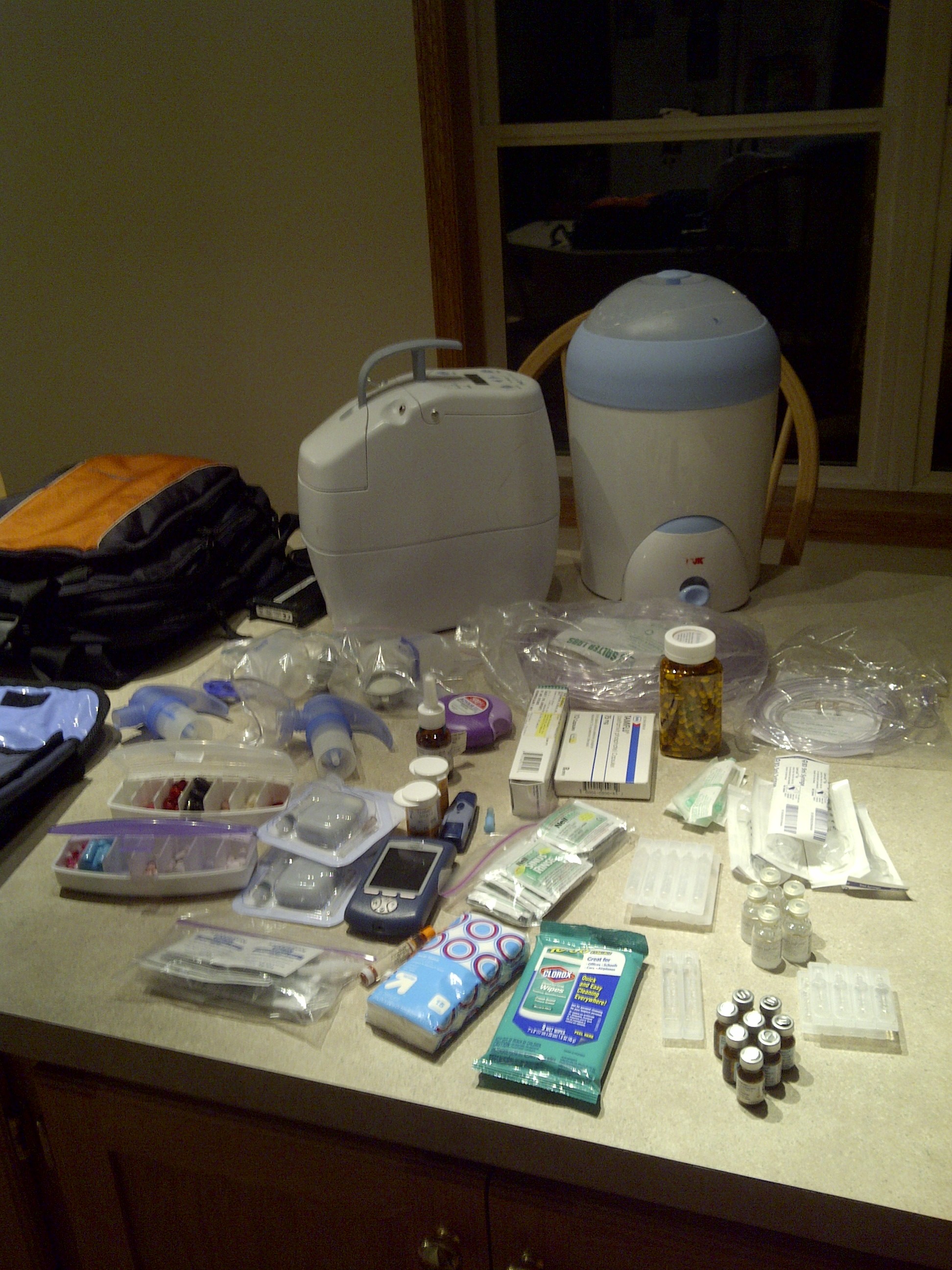 Packing is another thing even if it is just for an overnight as you can see in the photos above. I have many medications, devices, tubing, cleaning supplies, accessories, and oxygen tanks that have to be counted for. Forgetting one thing can be enough to have to turn around and come home. I have come up with a checklist which is very helpful. I also have to make sure all my equipment is working properly. Another thing I have to consider while using oxygen is that I have enough with me. Being stranded by weather, car troubles, or staying longer than anticipated are all things to think about.