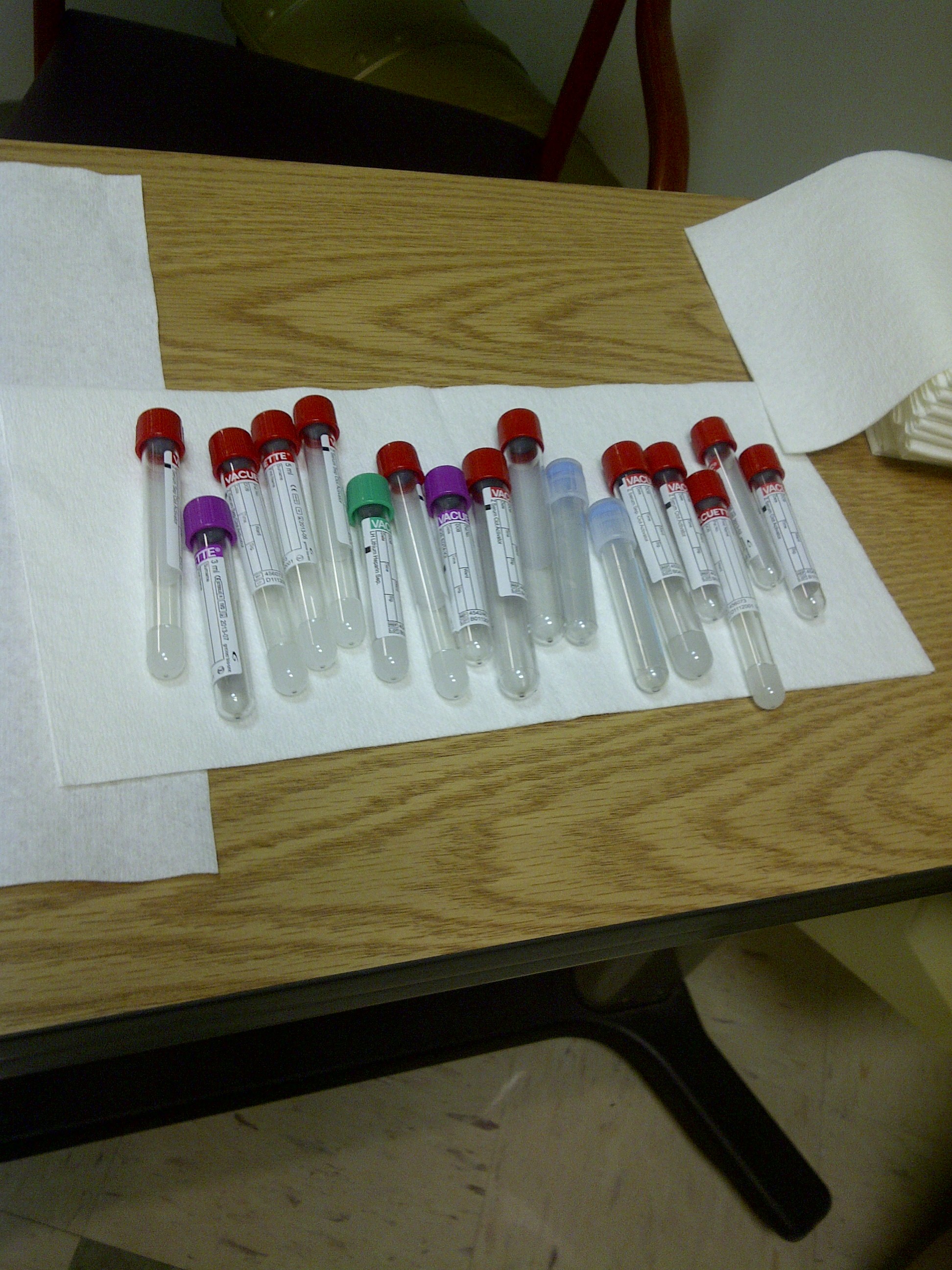 I did get some good news yesterday. March 1st I had my annual studies. They consist of chest x-ray, a lot of blood work, pulmonary function tests (PFT’s for short), a doctors visit, and every other year a bone scan. My results from all of the blood work was great. my body approved all of the other vaccines we have done. That is a good sign, now we just need this last vaccine to take. The picture below are of all the tubes of blood that are required for annual studies.