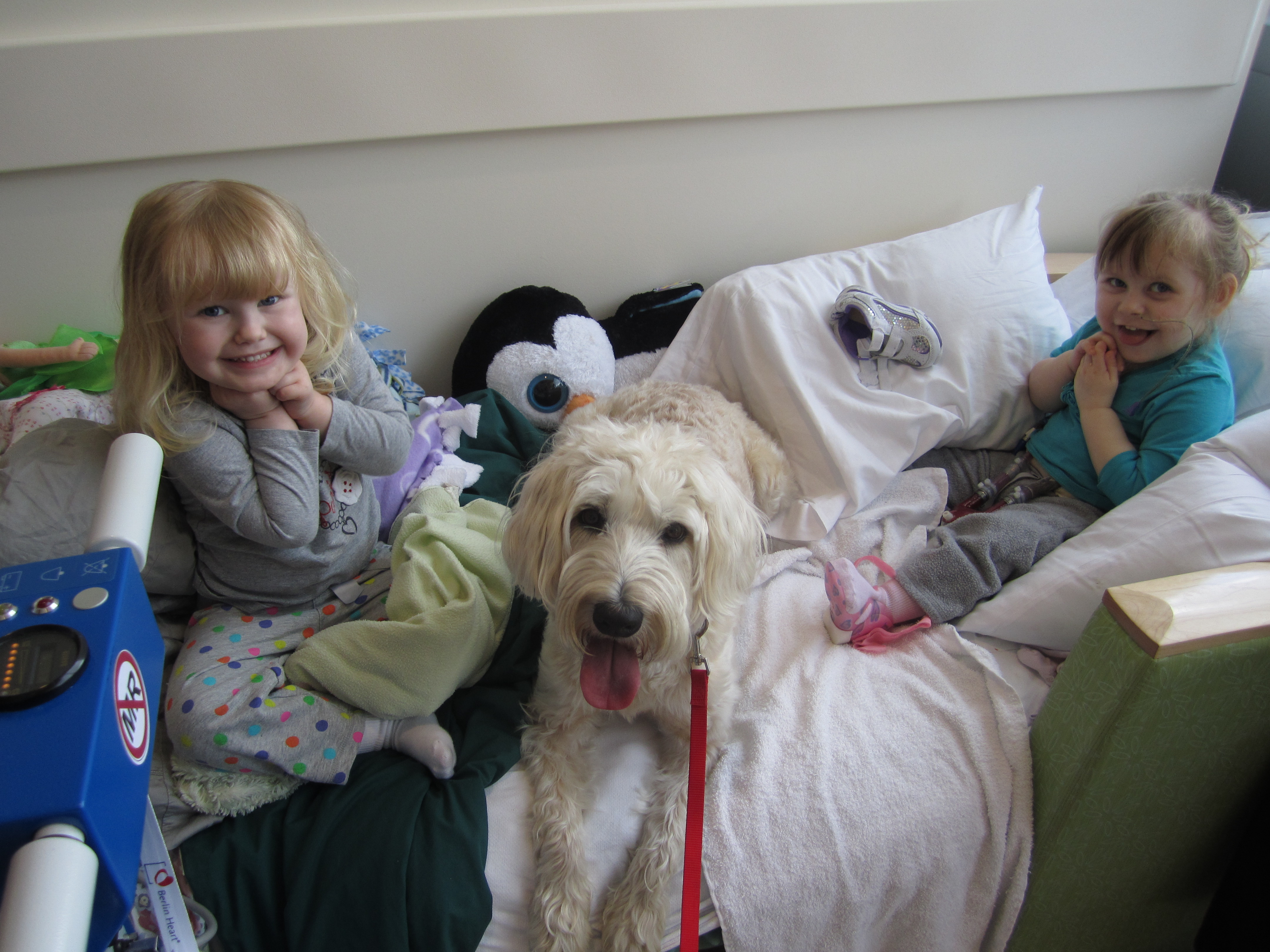 I had an appointment today that was on the University of Minnesota children’s campus. Knowing I was going to be in the area of the Amplatz Children’s Hospital, I thought I would bring my dog Rosie to visit Grace who is waiting for a heart transplant. Rosie has been in a hospital many times. Whenever I am admitted, Travis always brings Rosie for a visit. I know how much it means to break up the monotony of a hospital stay. As in this picture you can see the smile on not only Grace’s face but her sister Olivia too!