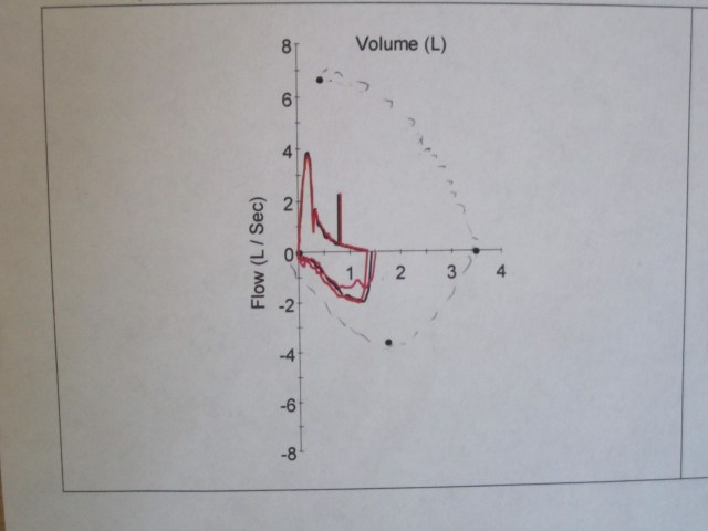 Want to see one of the reasons I am waiting for lungs? In the picture below is my PFT graph (pulmonary function test). The black dotted line is the predicted lung function for my age, height, and weight. My actual result is the red line. You can see the significant difference from a “normal” lung function to my own. I am only breathing with about 30% of my lung capacity. I can’t wait to show a bigger graph!