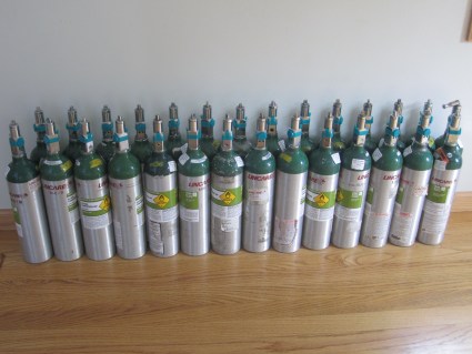 Every two weeks I have oxygen tanks delivered. I tell my oxygen company how many I need, they pick up the empties and leave me full tanks. Here is the line-up!