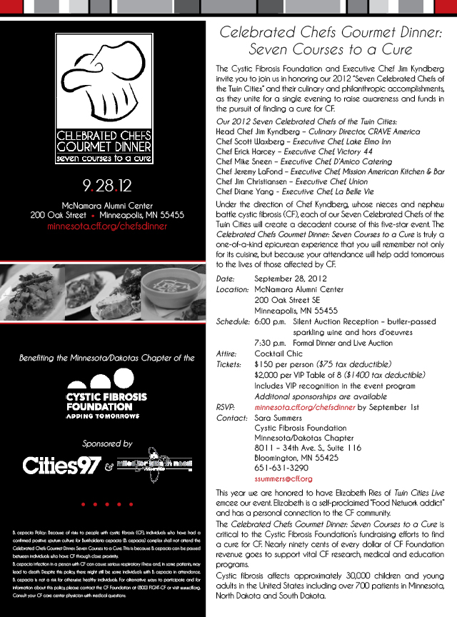 I would like to invite you to the 2012 Celebrated Chefs Gourmet Dinner benefiting the Cystic Fibrosis Foundation on Friday, September 28, 2012. A truly culinary delight consisting of a 7-course gourmet dinner made by some of the best chefs in town, wine and beer pairings with every course, a live and silent auction, and great speakers. I know it is coming up soon but there is still plenty of room if you would like to join us. Please email me if you have any questions at: nikkisnewlungs@gmail.com. I know the cost is $150, please note $75 is tax deductible. To purchase tickets you can click on the link CF Culinary Dinner Here are the details for the evening: