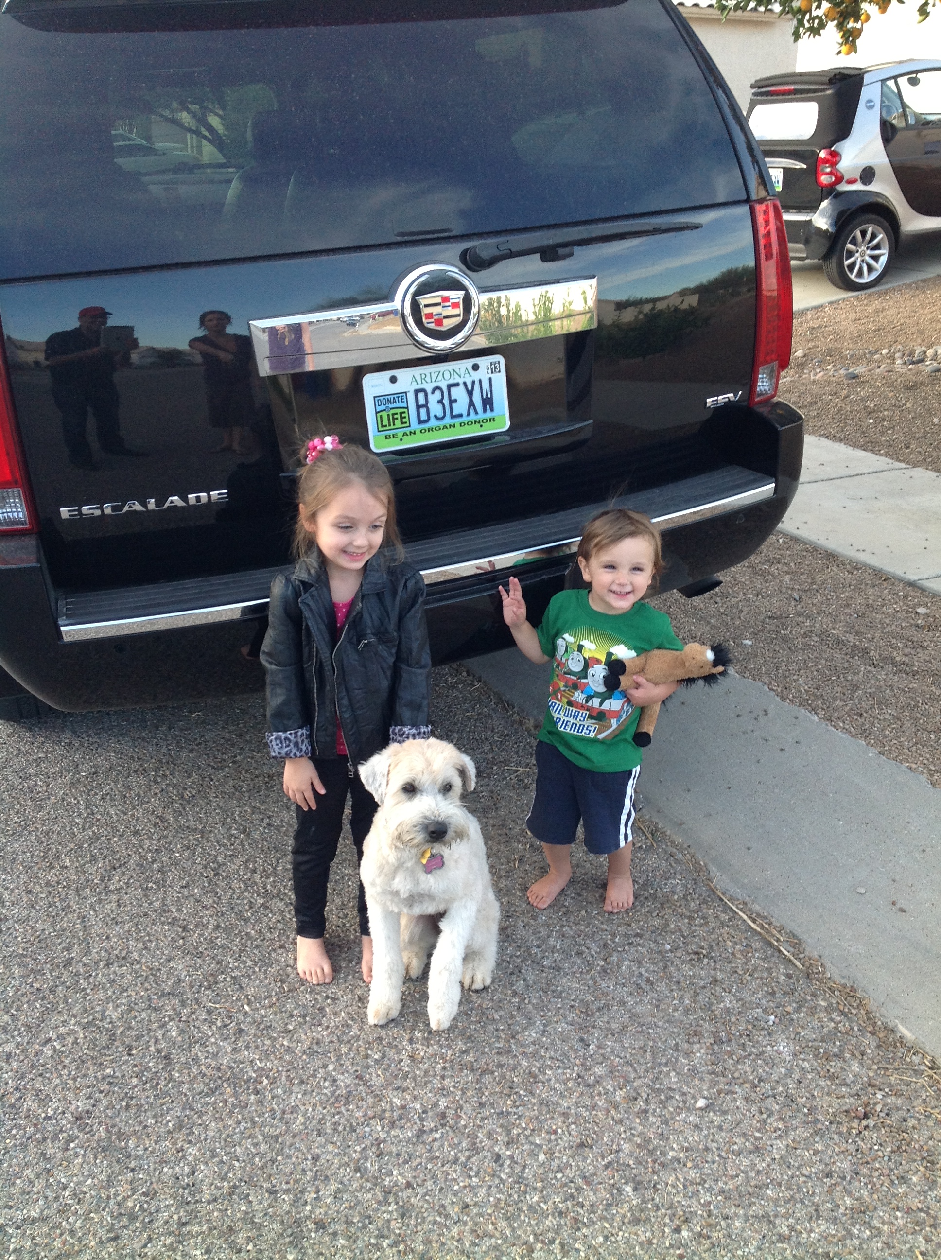 Our friends Habibi and Heather recently sent us this picture of their kids and dog Trikki. They “won” Rosie’s cousin Trikki two years ago at the same Cystic Fibrosis benefit dinner where we “won” Rosie six years earlier. They were very proud to sport the new “Donate Life” Arizona license plates. I wish Minnesota would offer these plates to help spread the word about organ donation. Thanks for all of the support! The kids, plates and pooch all look great!