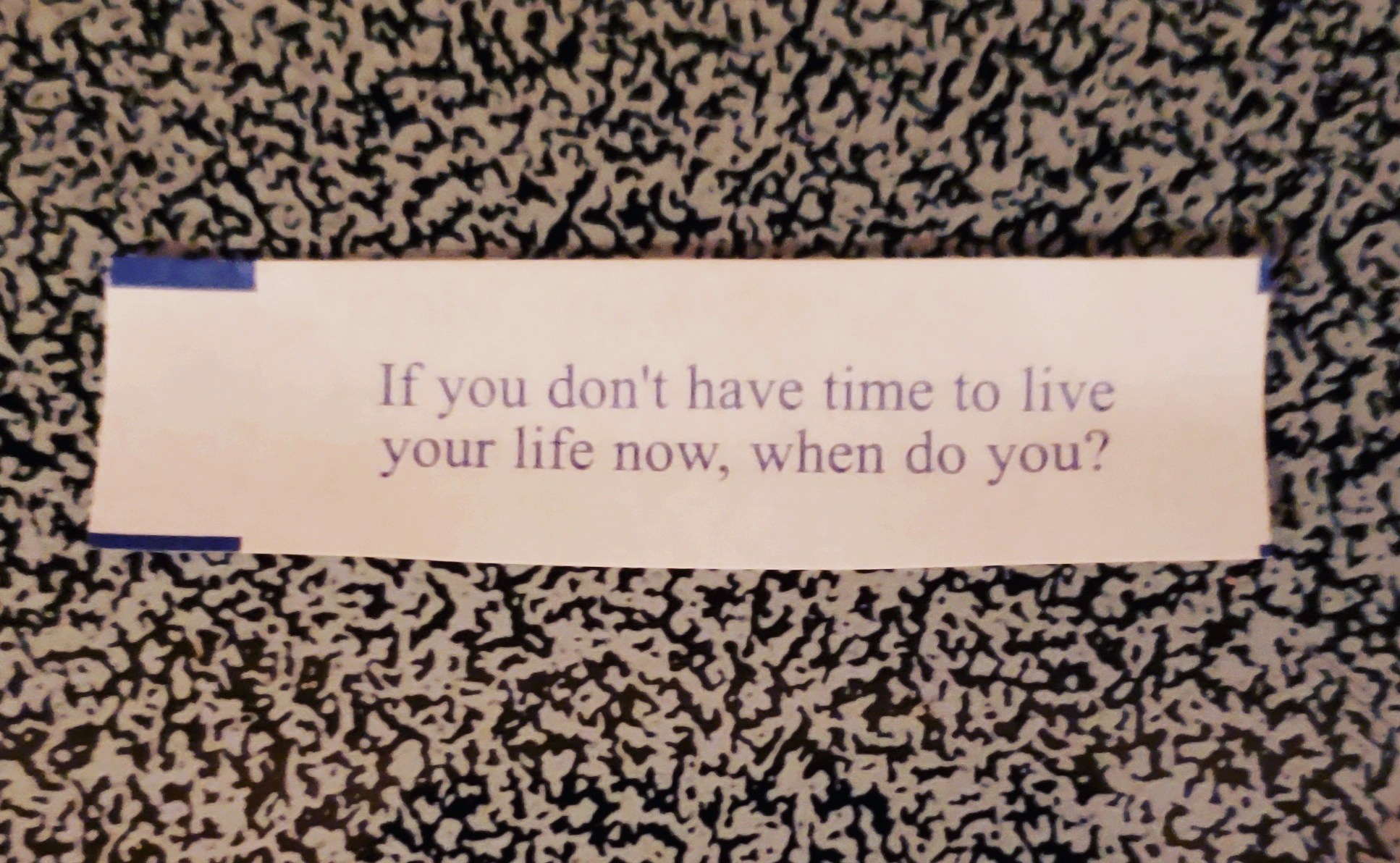 Tonight, someone had delivered Chinese food to our doorstep. We didn’t place an order for this meal and after confirming with the neighbors realized it was mistakenly placed on our porch. After an hour or so, I decided to bring it in. Since the fortune cookies were individually wrapped, I proceeded to open one of them. Not sure there could have been a more appropriate and “breath taking” message!!!