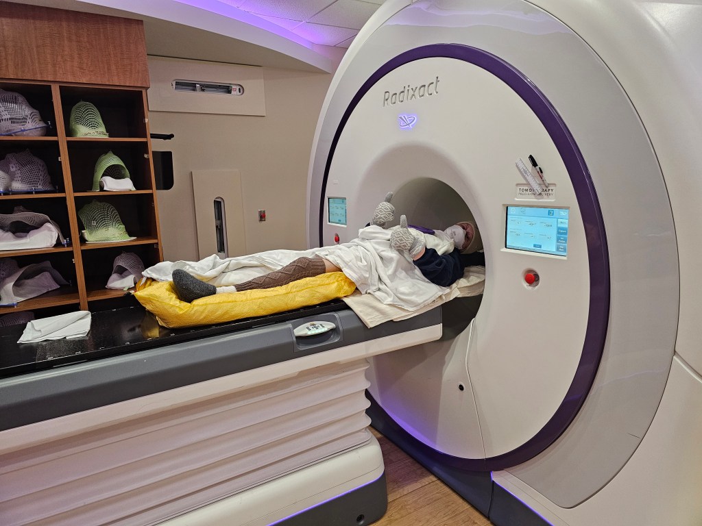The radiation itself lasts 7 minutes but I don’t feel anything during the session. It’s like a long X-ray. I do have to lay super still from the moment they line me up on the table, have the CT, check the scan, then administer the treatment. I’ve had pain issues afterward in my hips and thighs from lying in the mold for over 15 minutes or longer in total. It feels like I have done 100 squats once I’m finished! This gets very painful at the end of my weekly visits.