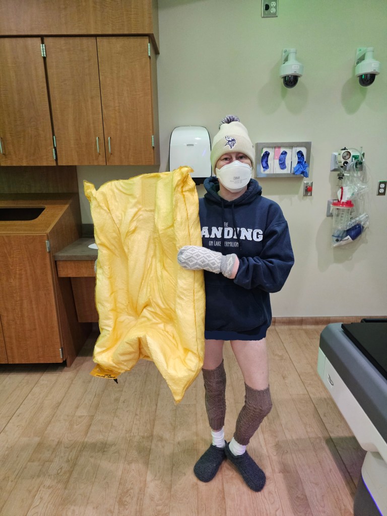 I do have to mention my fashion wardrobe or lack there of.🤣 During the 1st week of radiation treatments, I was so cold I was severely shivering. That room is cold down in the basement! We had to wait until I warmed up because I couldn’t be shaking during the treatment. I found my warmest sweatshirt, wool mittens, added booties that Travis had bought me made from Llama fur, and then one of the techs said, “It’s too bad you don’t have any leg warmers”. I turned and replied, “Oh, I sure do!” They were obviously just getting to know me and unaware of the clothes stashed all over our house and my Mom’s basement. I wear my rocket outfit every day and they also add 3 warm blankets on top of me. Thank goodness I don’t shiver anymore.